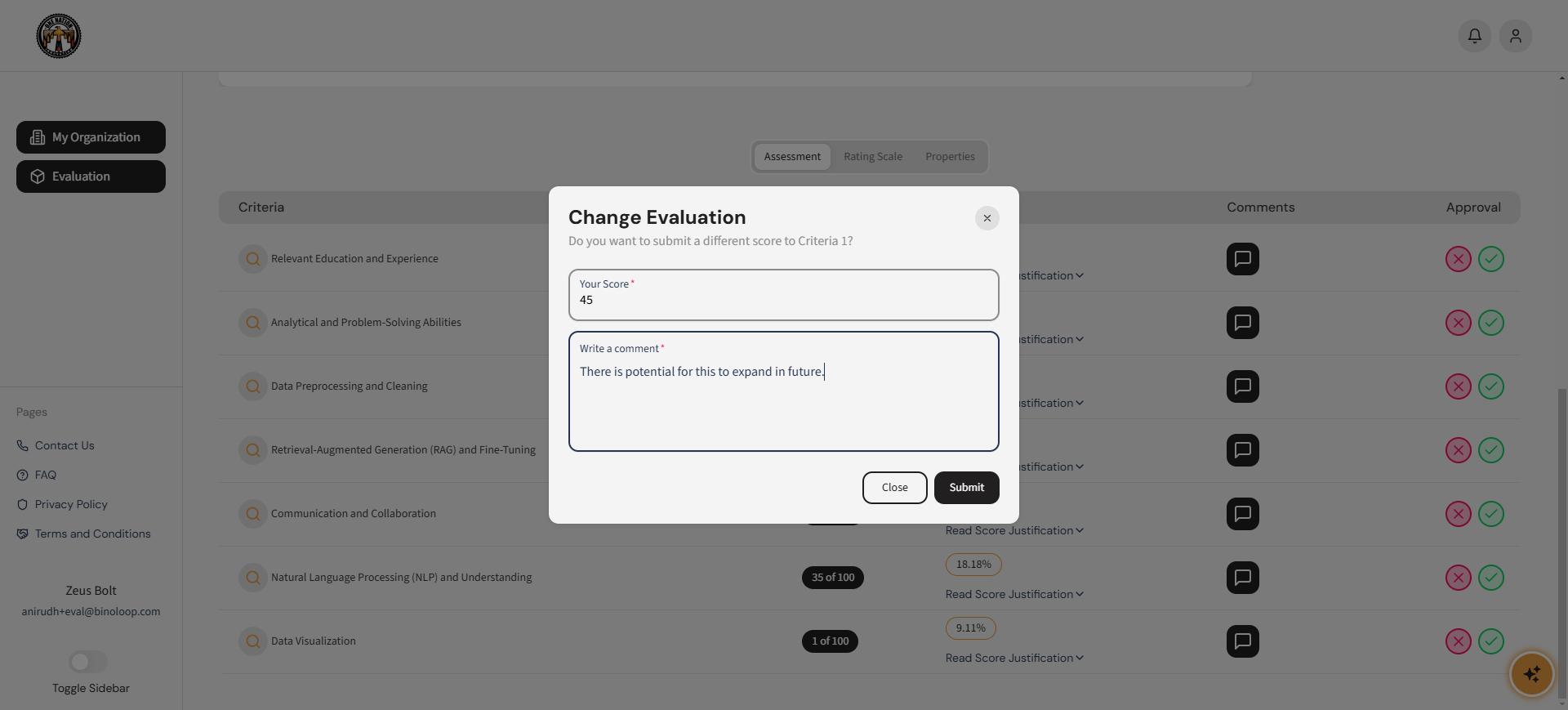 - Once all criteria are approved or modified, the evaluation is automatically submitted, and the challenge owner or Org Admin will be notified.